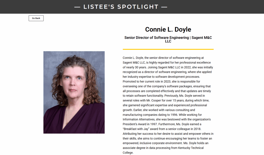 In her role as the senior director of software engineering at Sagent M&C, LLC, Connie L. Doyle oversees the company’s software package and ensures that all processes are completed on time, and that routine updates and deadlines are made in order to keep everything fully functioning. This position marks the most notable achievement of her career as it’s the highest level she’s reached. Prior to the promotion in 2023, she served as the director of software engineering at the company; her rise in success has been guided by her leadership skills, through which she helps others do their jobs and empowers them to excel.